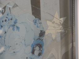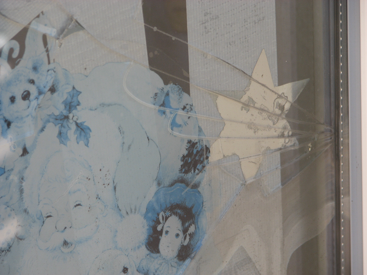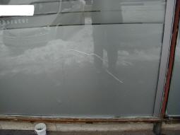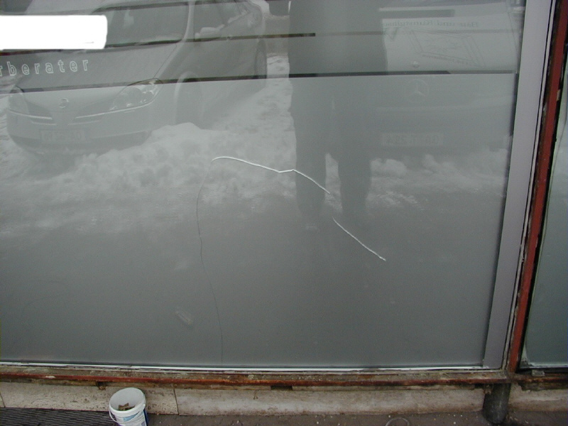 Foto nach dem Ausbau. Hier erkennt mann die wirklichen Gründe des des Hitzesprungs: Die Möbel wurden zu nahe an die innere Scheibe gebaut + Folierung + Verklotzung mit ungeeigneten Verklotzungshölzer. Eine Kombination die zu einem Glassprung führen muss, denn "normales" handelsübliche Floatglas kann solche Wechseltemperaturschwankungen als Schaufensterverglasung innerhalb großer Glasflächen nicht aufnehmen. Lösung des Problems: Einbau von Einscheibensicherheitsglas, denn dieses Spezialglas kann ohne Probleme innerhalb der Glasfläche 150 °C im Wechsel vertragen. Fachkenntnisse eines Glasermeisters... ;-)